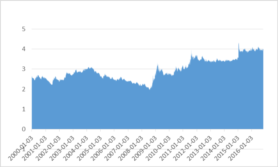 Wykres franka szwajcarskiego w latach 2000-2016