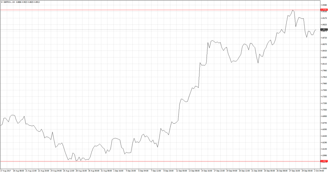 GBP/PLN również pozostaje w dynamicznym trendzie wzrostowym. Niemniej jednak widać delikatne oznaki wyhamowania. Za wzrosty odpowiada Bank Anglii, który zaprezentował dość jastrzębie stanowisko zgłaszając gotowość do zakończenia programu luzowania ilościowego. Jest to związane z dość wysokim tempem wzrostu cen w Wielkiej Brytanii. Mimo to jednak bank centralny nie ma wcale łatwej decyzji gdyż owszem presja inflacyjna jest duża ale przy kiepskim wzroście gospodarczym należałoby poczekać. Wyprzedany bardzo mocno funt miał jednak spory argument za odreagowaniem ostatnich spadków. I od dobrych kilku dni wykorzystuje ten fakt. Niemniej jednak trzeba pamiętać o tym, że nieco ucichły tematy związane z Brexitem i to zdecydowanie pomaga. Uwaga inwestorów jest skupiona w ostatnich tygodniach na innych sprawach, choćby polityki Fed, wyborów w Niemczech i teraz Katalonii. Wciąż jednak czekamy na informacje w sprawie negocjacji Brexitowych, a szczególnie jaki rachunek może Wielka Brytania zapłacić i jak długo jeszcze będzie miała dostęp do wspólnego rynku. Dzisiaj nieco gorzej wypadł PMI z Wysp ale nie wpłynęło to na rozwinięcie korekty na funcie. Oporem w przypadku dalszych wzrostów będzie ostatnie maksimum.