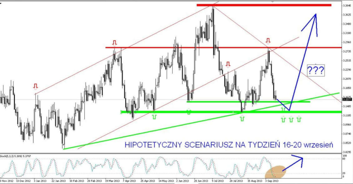 Niemniej jednak, wykres w tym momencie wskazuje, że cena chce opuścić kanał wzrostowy i dość mocno zniżkuje. W środę może jednak nastąpić zatrzymane. Wyjście z kanału nie jest potwierdzone mocnym impulsem podażowym na parze z USD/PLN. Złoty w każdej chwili może mocno się osłabiać w tym czasie i bez problemów może on nawet przebić poziom 3,30. Wskaźnik Stoch jest dalej dość mocno wyprzedany i sugeruje mocne odbicie się w górę jeśli tylko pojawi się popyt, co oczywiście będzie miało miejsce w środę, zobaczymy tylko w którym kierunku.