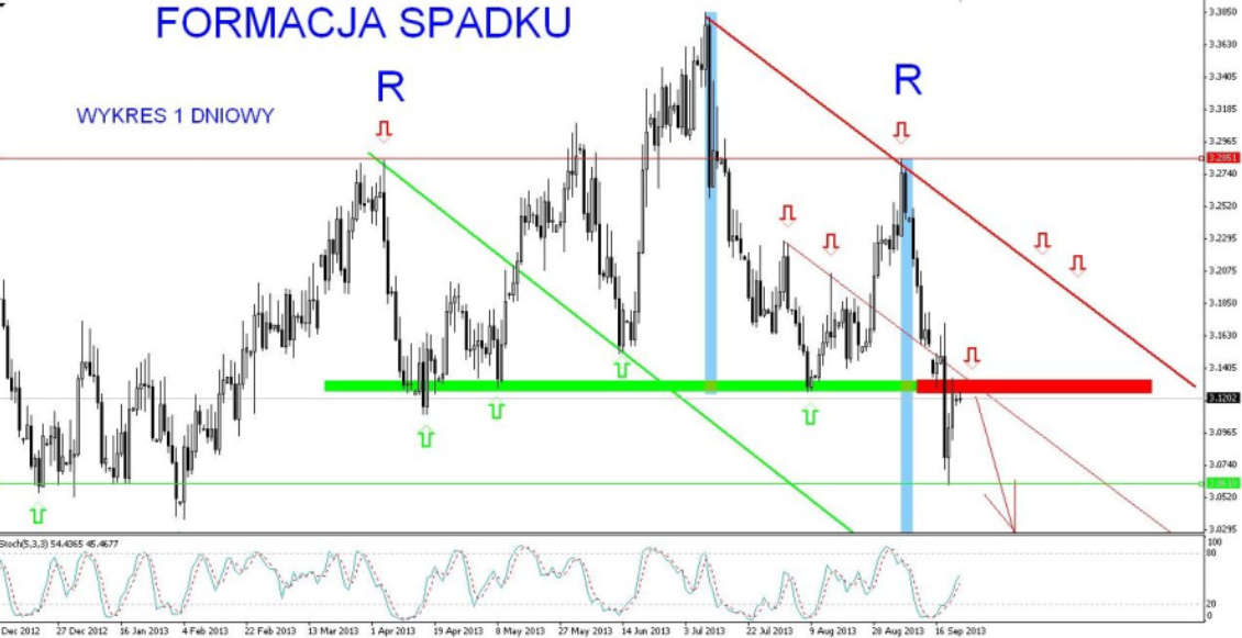 W ostatnim tygodniu kursy walut zmieniały się dość sporo. W poprzednią środę mieliśmy bardzo mocne spadki, które zostały szybko odreagowane w ciągu dwóch dni. W przypadku USD/PLN mamy bardzo silny opór przy 3,12, który wynika z przebitej linii wsparcia. Jest to obszar, w którym można doszukiwać się okazji do spadków. Dodatkowo wytworzył się dość szeroki kanał spadkowy ograniczony na wykresie poprzez LINIĘ TRENDU (czerwoną i zieloną).