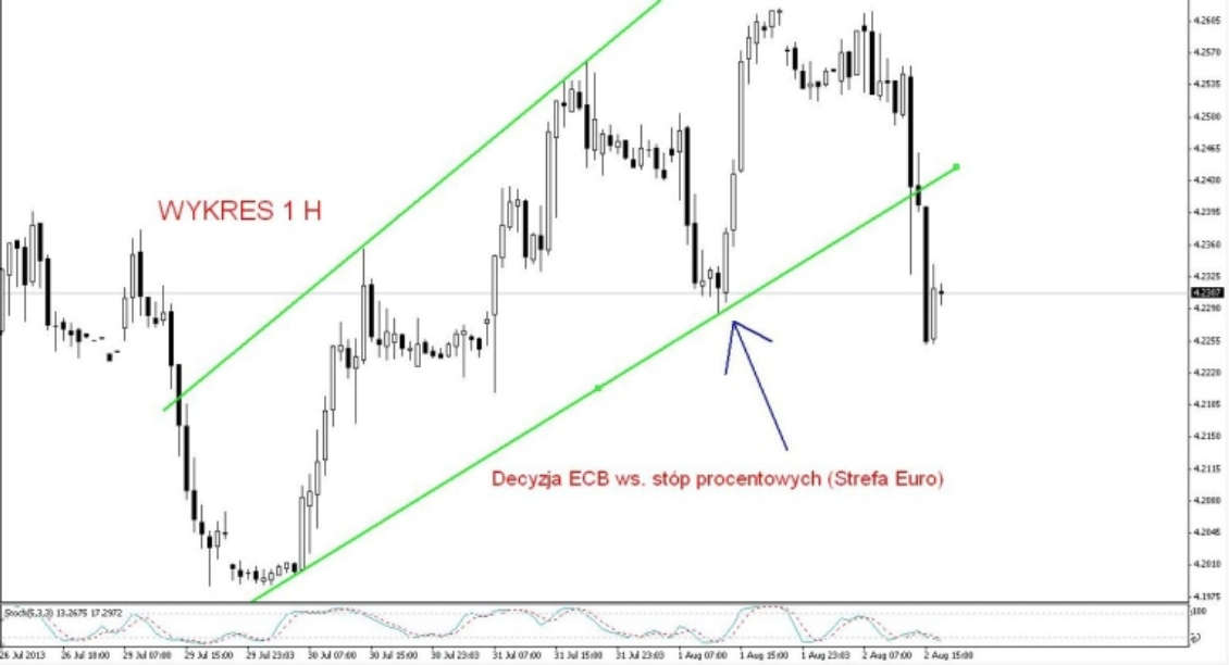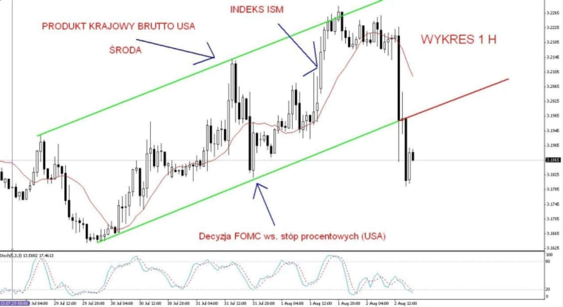Trend na parach z PLN zarysował się już wyraźnie w poniedziałek po danych o sprzedaży domów w USA, który okazały się gorsze niż miesiąc wcześniej (wskaźnik wyniósł -0.4%). W tym dniu nie pojawiły się żadne istotne doniesienia z polskiej gospodarki. Notowania USD/PLN osiągnęły swoje tygodniowe minima w okolicach 3.17-3.16. W tym tygodniu można też było łatwo wyrysować kanał, w którym zmieniał się kurs. Był to kanał wzrostowy. Dopiero w piątek dolna linia trendu została z impetem wyłamana.