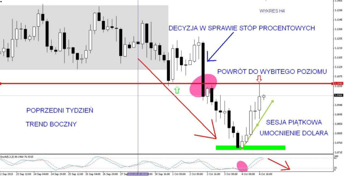 W środę, zaraz po danych o stopach procentowych, długą czarną świecą podażową zakończyła się konsolidacja. Dolar osłabiał się i dość szybko dotarł do poziomu 3,0730, a więc wciąż nie zdołał się wybić z dołka z dnia 19 września. Warto zauważyć, że w tym miejscu poziom wskaźnika Stoch był bardzo niski. Dołek ten nadal pozostaje poziomem wsparcia. Ciekawym na wykresie jest to, że cena idealnie dotarła do wybitego wsparcia na 3,1040 i potwierdziła tym samym możliwość dalszych spadków USD/PLN. Niewykluczone jednak, iż przed dalszymi spadkami cena spróbuje jeszcze dojść do 3,11.